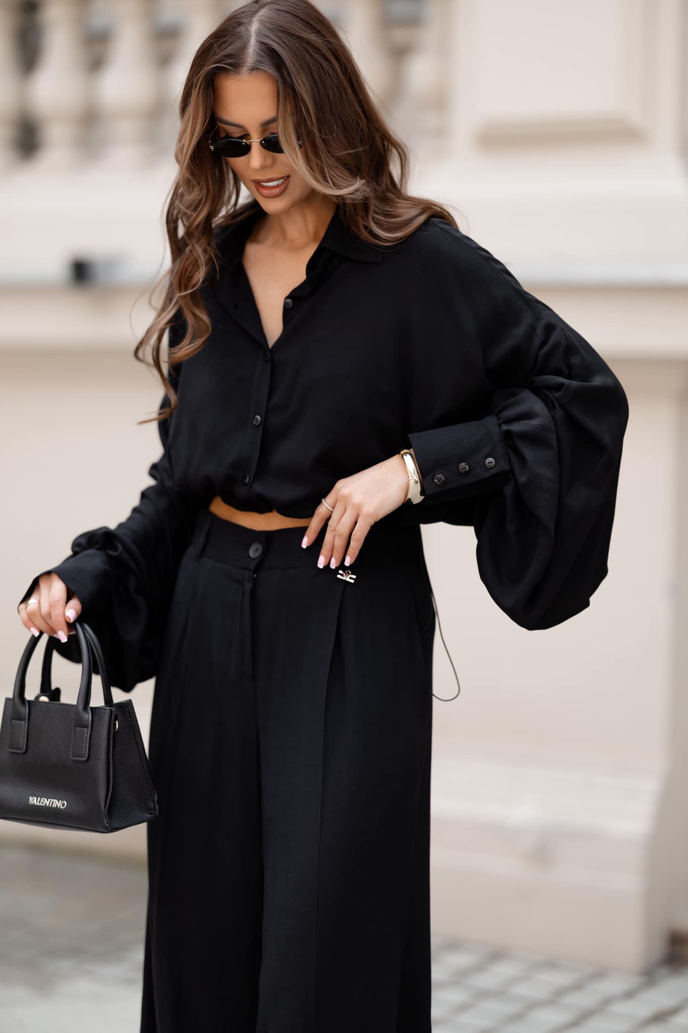 This shirt combines modern sophistication with effortless femininity. The wide, voluminous sleeves create a statement look, while the adjustable waist with a gold clasp allows for a flattering, customizable fit. The cropped design enhances your silhouette and makes this piece perfect for both casual and elegant outfits.